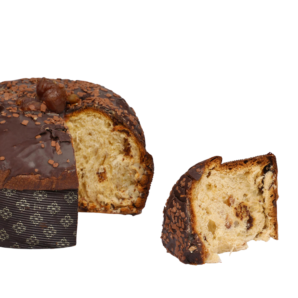 Soft WHEAT flour, candied chestnuts (15%) (chestnuts, sugar, glucose syrup), butter (MILK), sugar, chocolate coating (9%) (cocoa mass, sugar, cocoa butter, emulsifier: sunflower lecithin, natural vanilla flavour. Cocoa powder: minimum 60%), chestnut purée (9%) (chestnuts (45%), sugar), fresh EGGS from barn-reared hens, gianduja chocolate (6%) (sugar, HAZELNUT paste, cocoa butter, cocoa mass, emulsifier: SOYA lecithin, vanilla extract), fresh EGG yolk from barn-reared hens, natural leaven (sourdough) (contains WHEAT flour), chestnut paste (1%), Piedmont chestnut honey (1%), MILK chocolate flakes (1%) (contains MILK and SOYA), emulsifier: mono- and diglycerides of fatty acids, cocoa butter, skimmed MILK powder, salt, natural vanilla flavour.