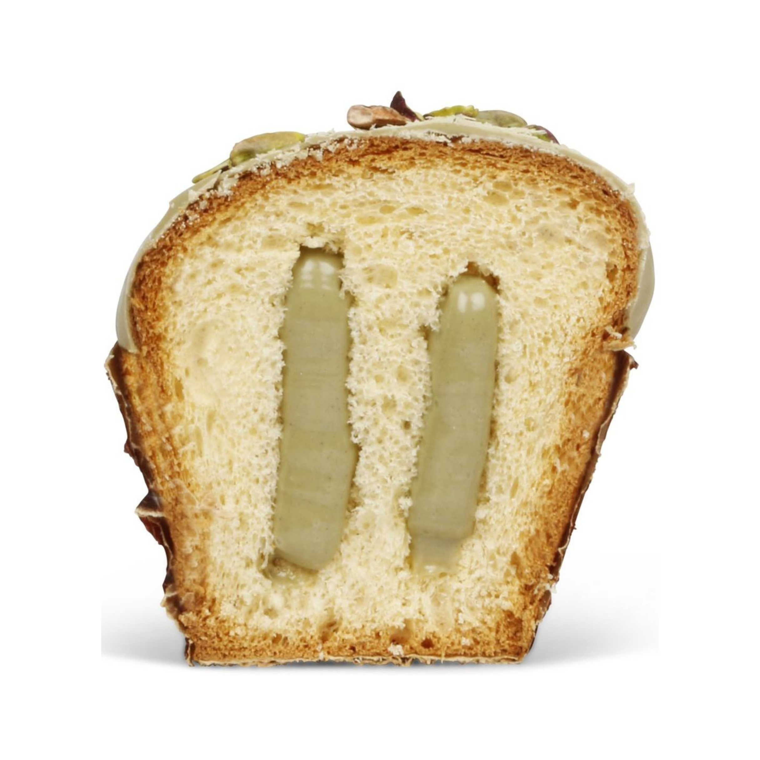 A luxuriously soft Italian bakery cake filled with rich, velvety pistachio cream and crafted using traditional slow-leavening methods. Light, buttery, and beautifully aromatic, each slice is finished with a smooth white glaze and topped with crunchy toasted pistachio pieces.